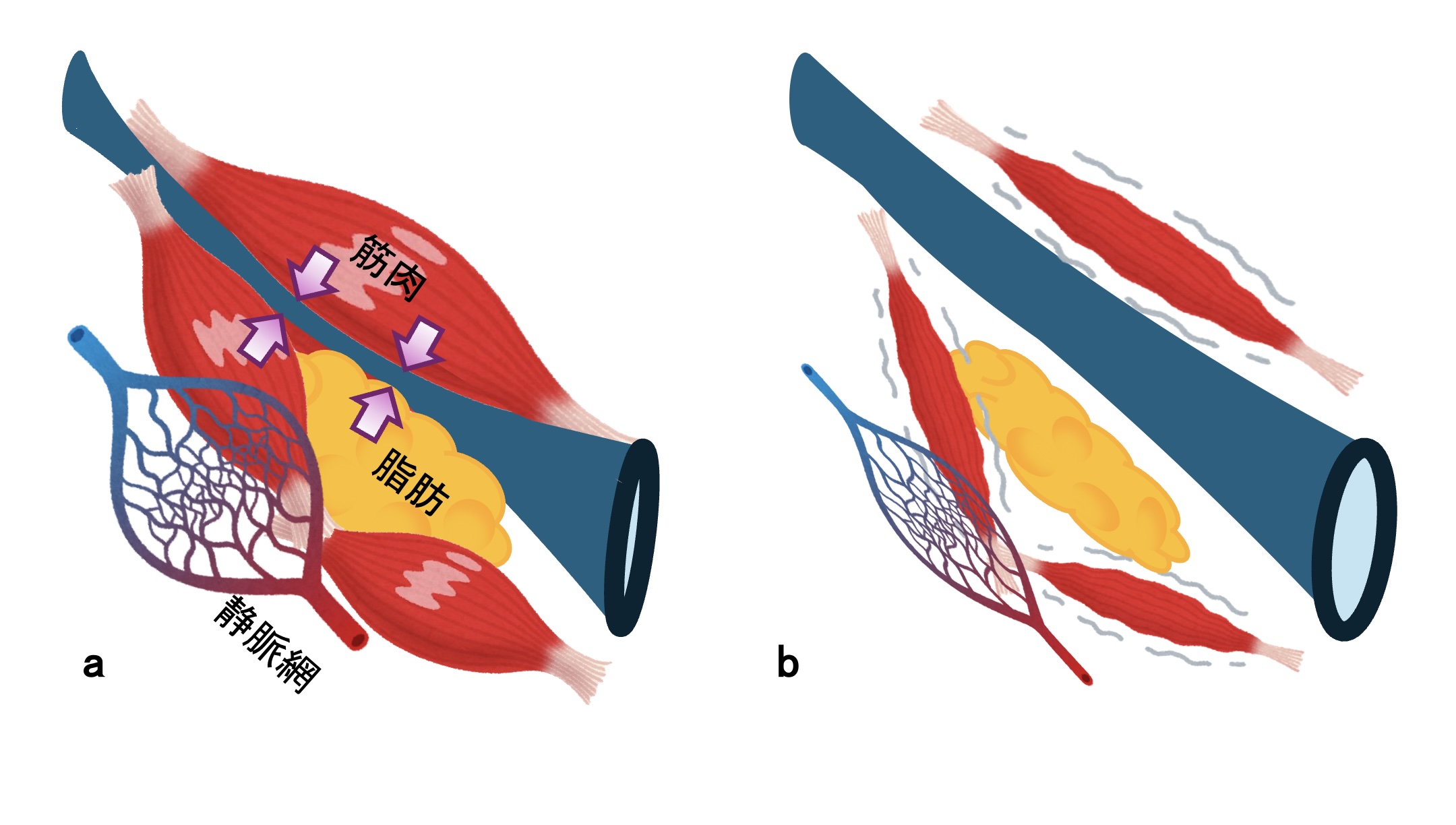 耳管は、周囲を満たす筋肉・脂肪・静脈網が四方から圧をかけることで壁どうしが押し合わさり、ふだんはぴったり閉じています図2a。飲み込みやあくびをすると、耳管を開く筋肉が一瞬働き、押さえ込まれた壁が離れて開きます。しかし、筋肉がやせて体積が減る、神経の麻痺で筋肉が使われず萎縮する、痩せすぎで脂肪が減るといった変化や、体内の水分が不足して静脈網が十分にふくらまなくなると、耳管を外側から押さえつける力が弱まり、ふだんから開きやすい状態になります図2b。